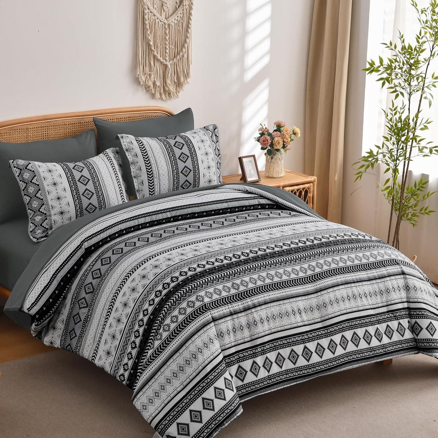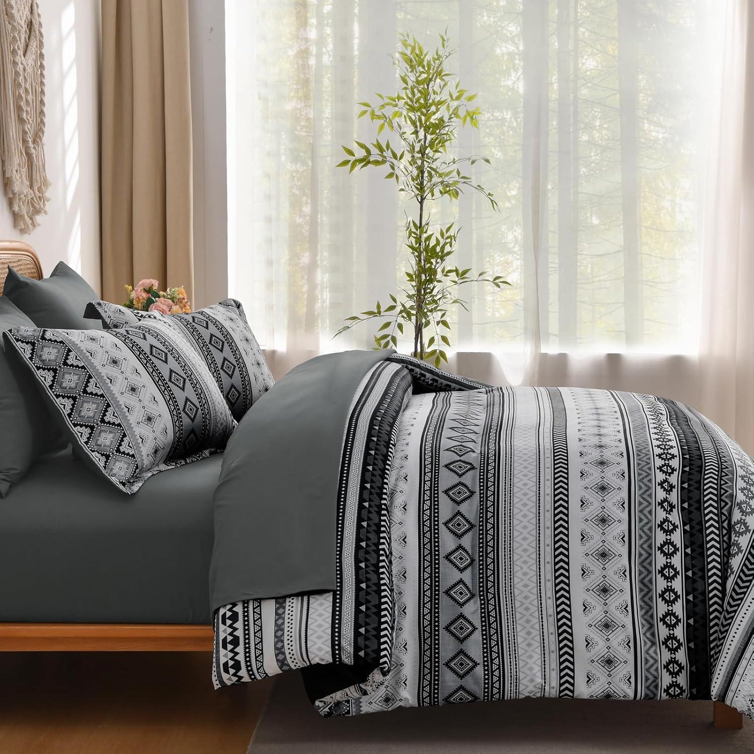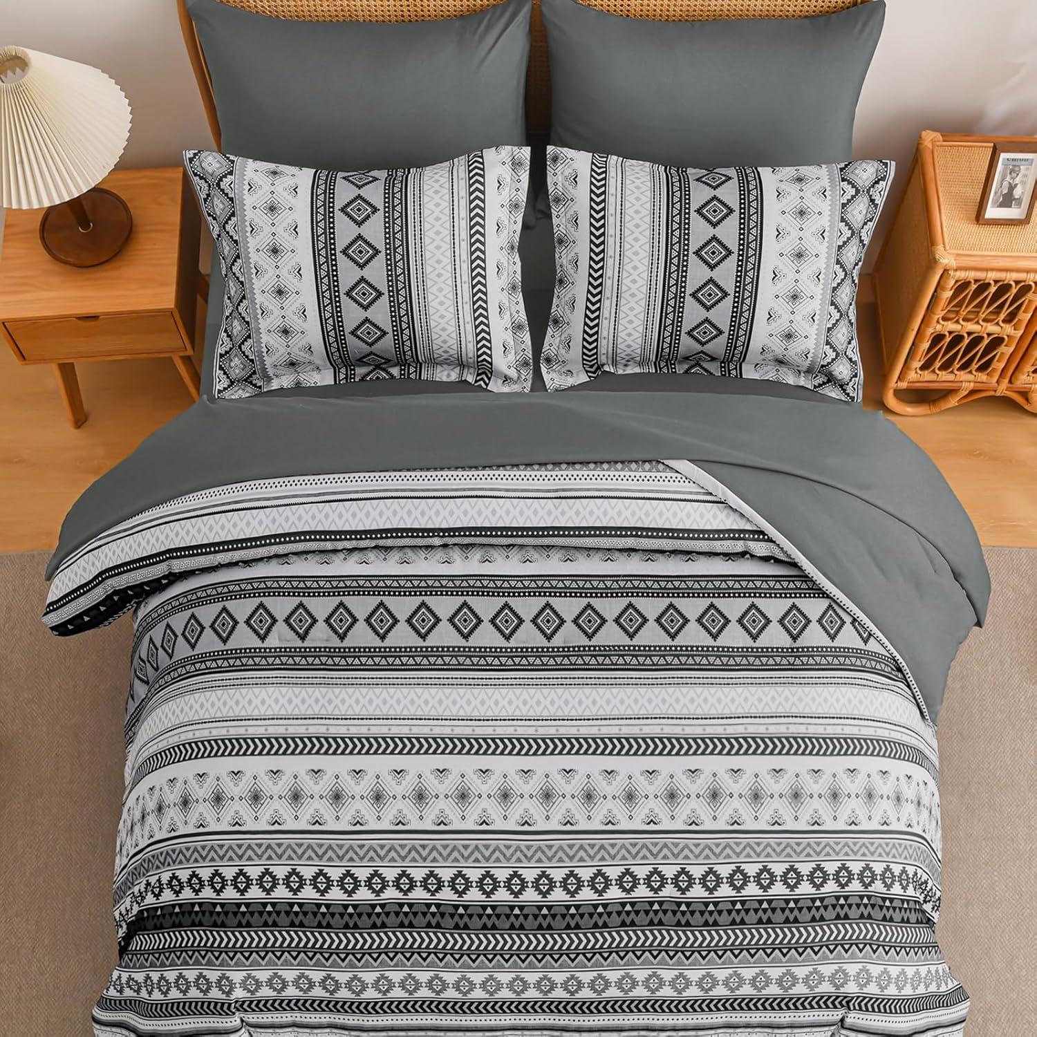 Mybedsoul Brown Aztec Style Comforter Set 7 Pieces, Queen Size Boho Bed in a Bag, All-Season Bedding Set with Sheets & Pillow Shams, Bohemian Geometric Striped Pattern(Black Grey)