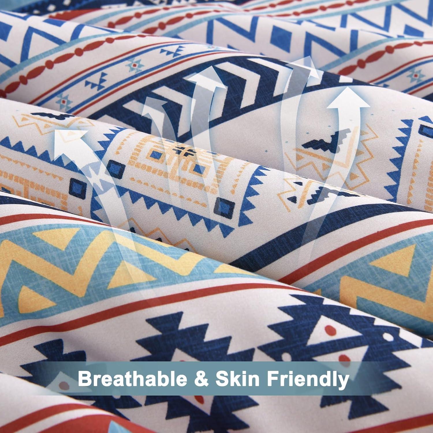 Mybedsoul Brown Aztec Style Comforter Set 7 Pieces, Queen Size Boho Bed in a Bag, All-Season Bedding Set with Sheets & Pillow Shams, Bohemian Geometric Striped Pattern(Blue)