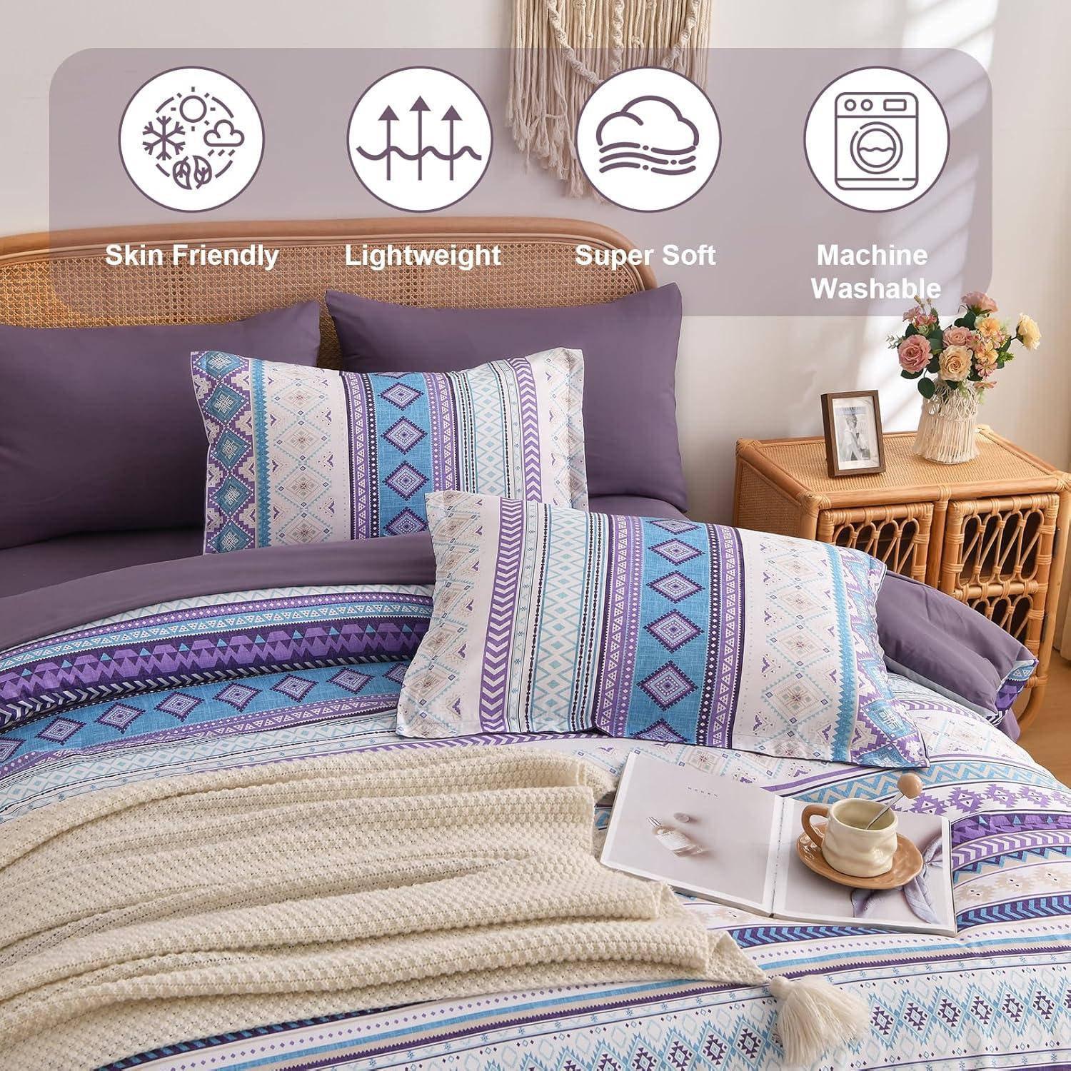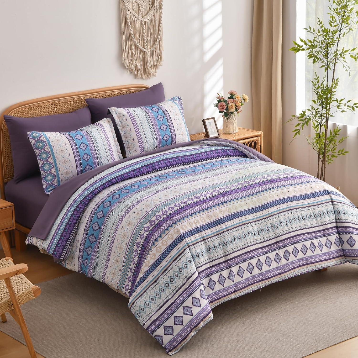 Mybedsoul Brown Aztec Style Comforter Set 7 Pieces, Queen Size Boho Bed in a Bag, All-Season Bedding Set with Sheets & Pillow Shams, Bohemian Geometric Striped Pattern(Purple)